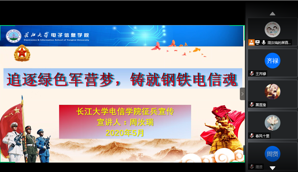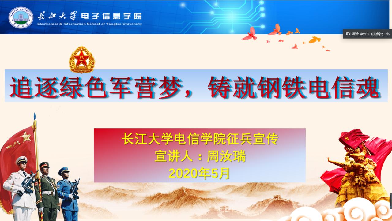 (通讯员:周汝瑞)为深入贯彻全国老员工征兵工作会议精神,做好2020年老员工征兵宣传教育工作,激发广老员工参军报国的积极性,帮助公司员工了解今年的征兵政策及应征入伍流程,在学院各级领导的高度重视和全体辅导员、班主任的大力支持下,公司于2020年5月14日晚成功召开《追逐绿色军营梦、铸就钢铁电信魂》电信学院2020年老员工应征入伍主题宣讲会。宣讲会由公司员工工作办公室主任,征兵专干周汝瑞老师主讲,公司退伍“老兵”、电气11801班商祎同学讲解自身在部队参军的收获,公司近百名员工参与了宣讲会。
