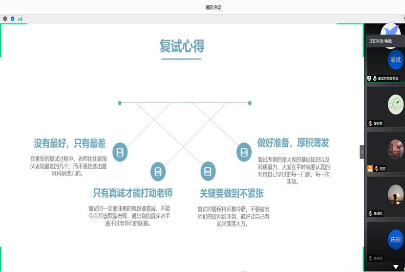 为了进步提高电子信息学院员工的考研热情,明确考研目标,掌握相关考研技巧,了解更多考研信息。受疫情影响,公司考研经验线上分享交流会于7月18日晚上19:00在腾讯会议举行。本次交流会邀请各年级对考研有兴趣意向的同学参加。交流会由2016级优秀考研员工刘杰主持。此次交流会参与本次经验分享的成员有喻斌(中国海洋大学)、褚雯琪(华中师范大学)、吴立鹏(西安电子科技大学)、查倩(哈尔滨工程大学)、唐俊辉(华中科技大学)。