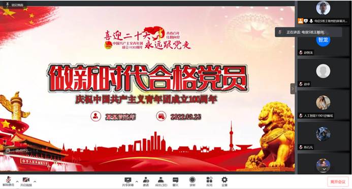 4月27日晚,人工智能11901支部校级班团会线上举行。本次团会以“喜迎党的二十大”为主题,号召青年团员要发挥“党有号召,团有行动”的光荣传统,坚定不移听党话,跟党走;会上还就“传承冬奥精神”进行了分享和交流,活动邀请在京青年代表进行冬奥故事分享,团结带领青年奋进新征程、建功新时代,继续发扬北京冬奥会、冬残奥会中彰显出的担当尽责精神,为时代建设贡献力量。最后人工智能11901班班主任伍鹏老师为本次班团会做了总结讲话,给同学们提出了宝贵意见。