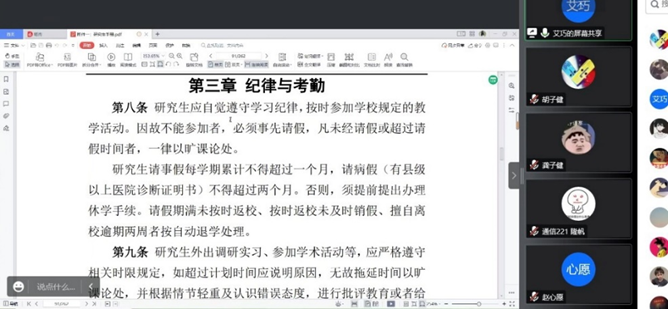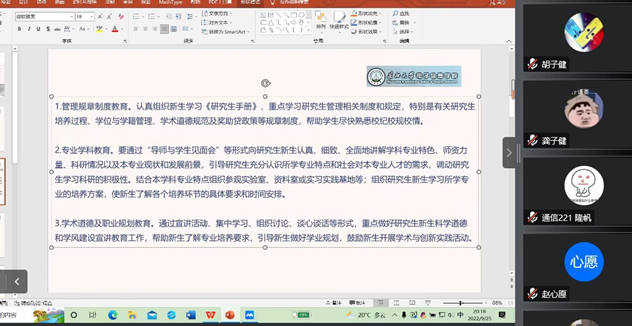 (通讯员:王迎盈)9月25日晚上八点,为了引导和教育新生更快更好地融入新阶段的学习和生活,公司召开了2022级研究生新生入学教育,基于疫情防控等原因考虑,本次会议线上举行,未返校的同学通过腾讯会议同步参会。出席本次班会的有辅导员康玮,2020级研究生学姐艾巧,2020级研究生学长李问周以及全体2022级研究生新生。会议由艾巧主持。