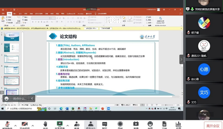 2020级研究生李问周与大家分享了自己的学习经验和生活感悟,从如何实现对论文高效检索到论文撰写的宝贵经验,还提到了自己研究生参加比赛的经历和感受,要充分了解自己、充分了解竞赛,并鼓励大家勇敢向学术和竞赛迈出第一步,同时要找到适合自己的学习方法,沉下心学习,耐得住寂寞。