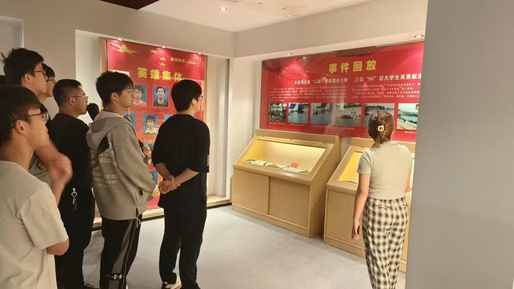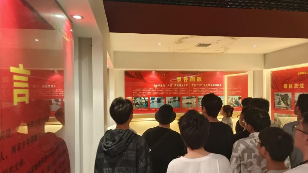 馆内的图片、影像、物品加上讲解员的讲解让同学们切身感受到陈及时、何东旭、方招三位烈士见义勇为的无私壮举。2009年的10月24日,两名少年落水,十五名长大学子手牵着手搭起了生命之桥—人链,最终两名少年获救,而陈及时、何东旭、方招三位员工却永远地留在了汹涌的江水中。