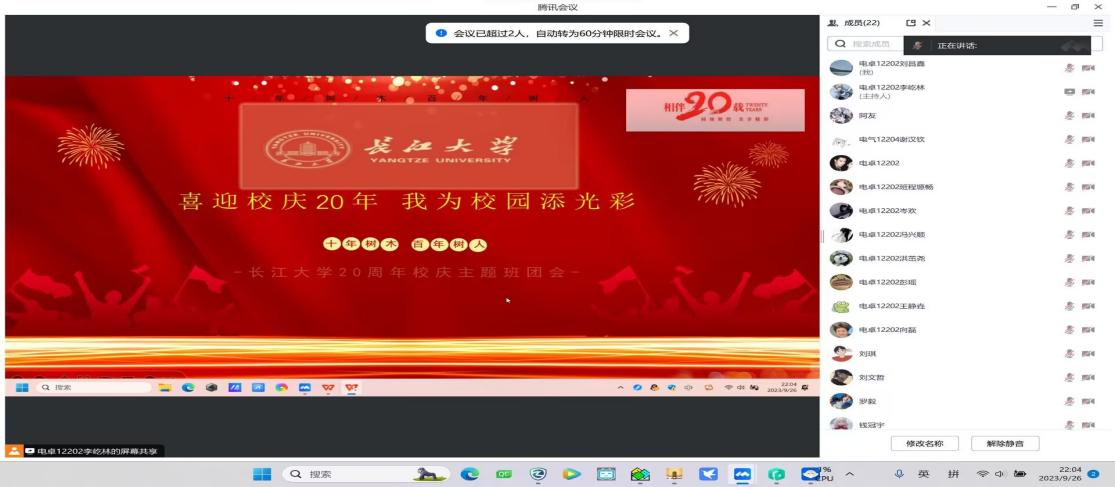 9月26日晚,电卓12202团支部班团会通过线上腾讯会议成功举行。会上,同学们深入了解学校合并组建20周年暨高水平大学建设主题活动,认真学习校史校情、学科发展史、学脉文脉传承等内容,并开展了防诈反诈安全教育宣传。李屹林同学详细介绍了校庆安排,认真组织青年学子通过线上线下相结合的方式积极参与20周年系列活动,在校庆期间主动成为礼仪文化传播的先锋。