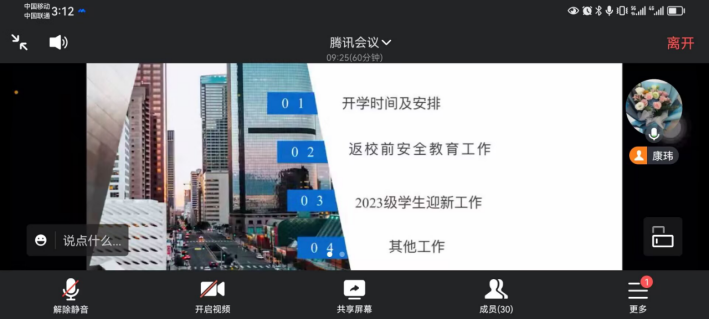 9月25日晚上8点,为了引导和教育新生更快更好地融入新阶段的学习和生活,公司召开了2023级研究生新生入学教育,本次会议线上举行。出席本次班会的有辅导员康玮,2022级研究生学长尚玉豪以及全体2023级研究生新生。会议由尚玉豪主持。