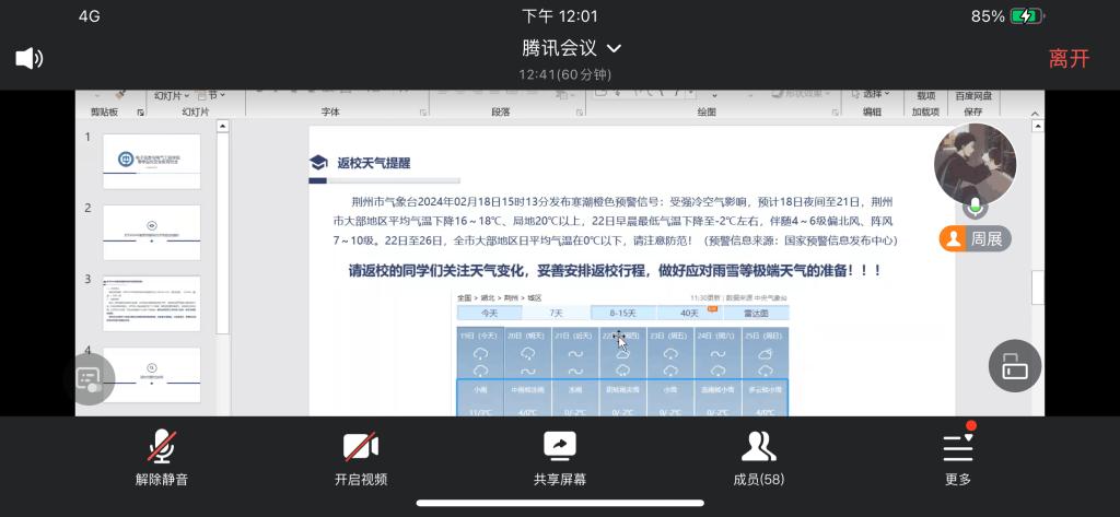 为做好2024年春季开学工作,确保员工安全、有序返校,伟德bv1946官网于2月20日组织全体研究生召开了春季安全返校教育主题班会。 会上,辅导员康玮传达了学校有关春季开学员工返校工作会议精神,对提前返校、延迟返校员工申请审批手续办理、员工返校行程安排报告等事项提了要求,重点提醒员工关注天气变化,妥善安排返校行程,做好应对雨雪等极端天气的准备,并开展了返校交通安全专题教育。 通过此次主题班会,明确了同学们对当前返校手续的要求,提升了同学们返校途中的安全意识。 (审核 张晨露 编辑 颜国琼)