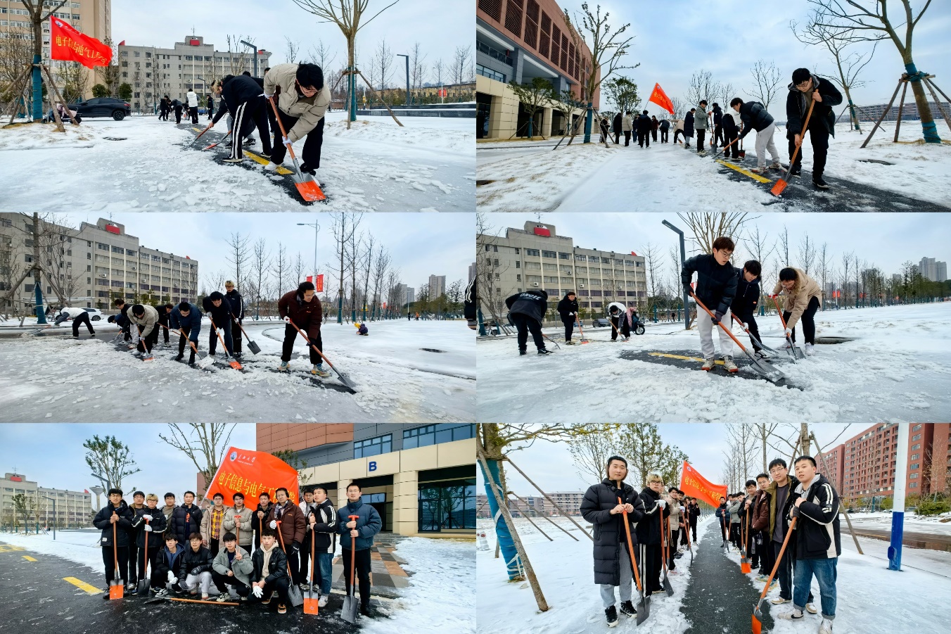 龙行龘龘,新程再启。刚刚结束了新春佳节,新的学期已然来临,湖北持续性降雪和冻雨天气使得校园积冰深厚,给师生出行带来不便。为方便师生返校,保障安全出行,2月24日,学院积极响应学工部号召,组建了一支师生铲雪除冰突击队,在校园内开展铲雪除冰行动。号召一经发出,就得到了已返校同学们的热烈响应。