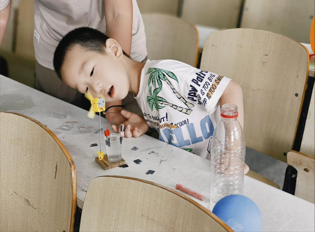 7月8日下午2时许,“愿益”社会实践团队带领伟德bv1946官网周边社区中小员工来到伟德bv1946官网12教1楼,带领他们亲身参与人工智能小实验,感悟科技的奥妙。在科技展里,“愿益”团队本科生实践队选择以科普小游戏为切入点,向中小员工展示电子信息学院员工的课程设计作品,帮助他们了解科技文化知识,并激发他们对科学技术的兴趣。除了理论知识外,团队开展了科技小课堂活动——“盐水发电”、“柠檬电池”、“动力气流”等诸多模块,并配有专门的志愿者进行演示,向他们讲解其中的实验原理,然后在志愿者的监护下,让小朋友也可以尝试这样的小实验。让孩子们亲自参与一些简单的应用实验,从而增强孩子们的动手能力,将所学知识与实际应用联系起来。