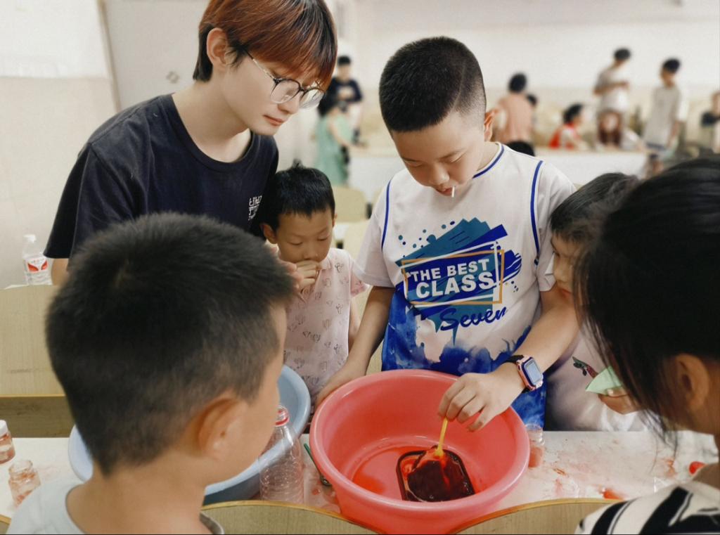 图为“愿益”志愿服务团队成员带领小朋友做趣味科技实验—海底火山