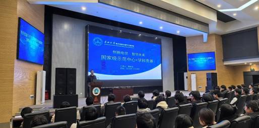 周经理围绕国家级电工电子示范中心和学科竞赛相关的内容展开了细致的讲解。以“为什么要参加学科竞赛?”“电信学子的学科竞赛有哪些?”“如何参加学科竞赛?”三个问题为引,引用习近平总书记给中国国际老员工创新大赛参赛员工代表的回信内容,为同学们讲解了参加学科竞赛的意义,并逐一分析了电信学子能够参加的学科竞赛种类、主办单位、赛事特点、参与方式等。