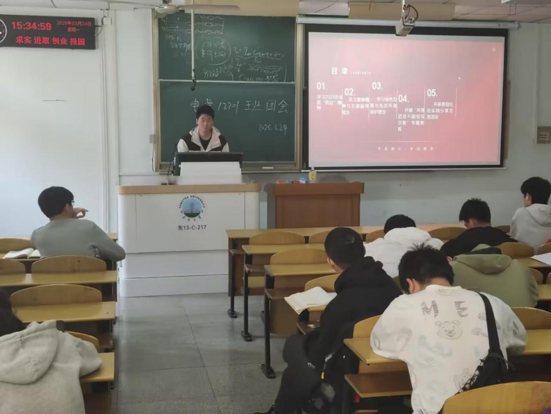 电气32401团支部于3月23日晚八点在西校区5教216教室举办班团会。卢娇洋同学先是围绕2025年全国两会精神,结合实例解读习近平总书记重要讲话,让同学们对国家政策有更清晰的认识。随后,在雷锋精神与志愿服务、绿色发展等讲解中,主持人设置互动环节,引导同学们身体力行践行环保行动。同时,“共青团员不能信仰宗教”专题教育筑牢了团员的思想防线。团课尾声开展寒假社会实践分享,团员们互相交流彼此的优秀作品,提高了同学们彼此之间的了解。此次内容丰富的团课,极大提升了同学们的思想认识,激励他们以实际行动为国家发展注入青春力量。