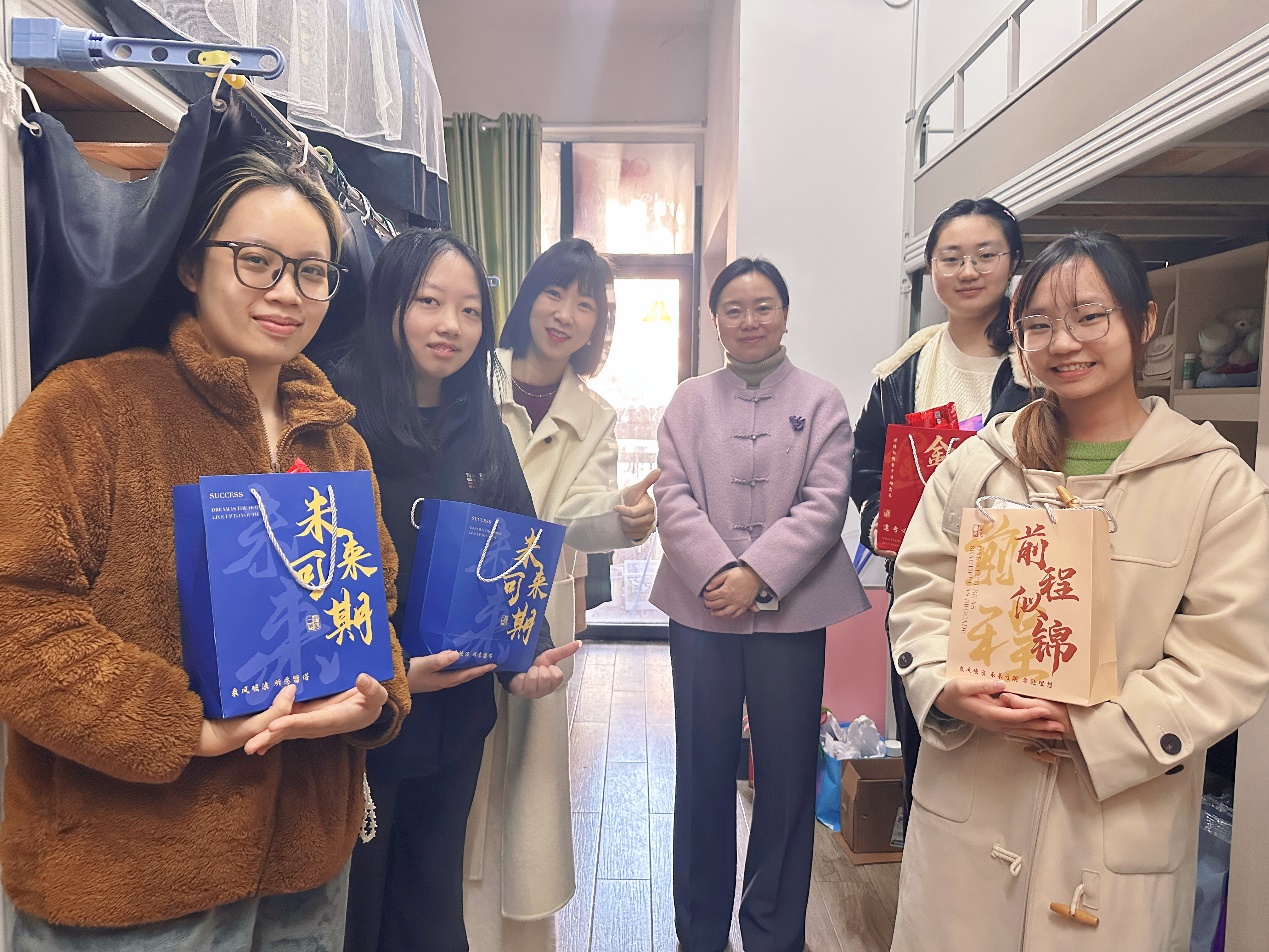 12月19日,公司党委书记郭梅、党委副书记张晨露深入考研学子宿舍走访慰问,为2026届备考学子送上暖心大礼包。走访中,领导们与学子亲切交谈,细致询问复习进度与生活困难,叮嘱大家劳逸结合、调整心态。满载关怀的礼包与暖心嘱托,让备考学子倍感鼓舞,纷纷表示将带着这份支持全力以赴,冲刺考研目标。