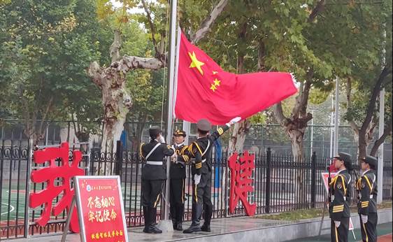 升旗仪式第一项,在7点整升旗仪式正式开始,国庆护卫队的旗手们穿着统一的军装,迈着整齐的步伐朝国旗杆走来。升旗手振臂一挥,鲜艳的五星红旗徐徐展开,迎着蒙蒙细雨飘荡在伟德bv1946官网的上空,全体人员注视着国旗奏唱国歌。
