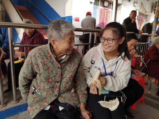 尽管天气寒冷,志愿者们仍然全部准时到达集合地点,在经过半个小时的路程后,同学们到达了荆州市金秋老年公寓,经理等人对于同学们的到来也表示了欢迎,爷爷奶奶看到了同学们,脸上也洋溢出幸福的笑容。根据同学们事先分配好的任务,每个人一来到老年公寓就主动开始了工作,有人扫地,有人切水果,有人搬凳子,还有人坐在老人旁边聊天、、、打扫完毕后,同学们愉快地和老人们做着游戏,不仅同学们和班主任老师阮宁君都献上了自己擅长的歌曲节目,就连老人们主动为同学们展现美妙的歌喉,现场十分热闹。看着老人们脸上温暖的笑容,同学们也感到无比的开心。