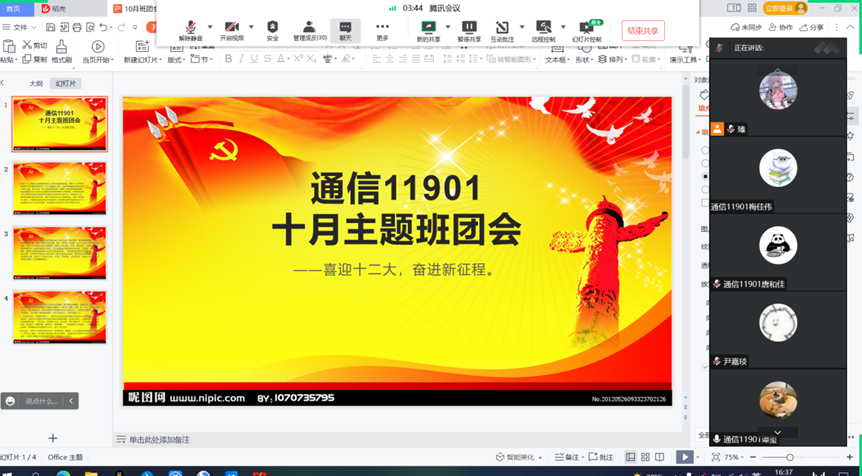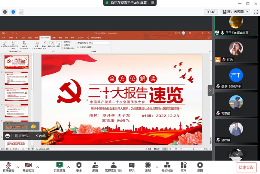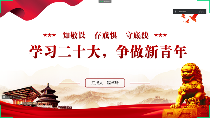 12月16日,人工智能12101团支部线上举行班团会。本次活动以“学习二十大,争做新青年”为主题,同学们认真学习了习近平总书记在中国共产党第二十次全国代表大会上所作的报告和发表的重要讲话精神。通过这次学习活动,引导全体青年老员工更加深刻的领悟党的二十大精神,为实现第二个百年奋斗目标奉献自己的力量。