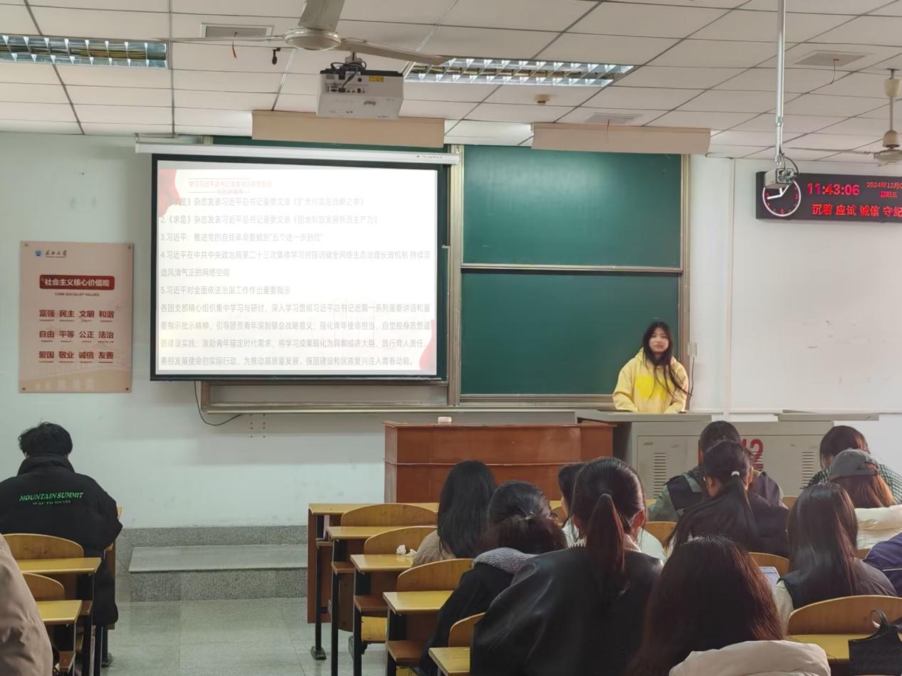 人工智能12403谢宇菲聚焦“深学笃行全会精神,挺膺担当时代使命”展开讲解。她先以思维导图的形式梳理了全会的核心部署与青年发展的关联点,随后结合班级学习、校园实践、志愿服务等日常场景,抛出“作为员工,如何将全会精神融入专业课学习?”“在校园活动中怎样体现青年担当?”等问题。同学们纷纷举手回应,有人提出要在专业竞赛中攻坚克难,有人表示要积极参与社区志愿服务,现场互动问答的形式让全会精神的学习从“听”转化为“思”。