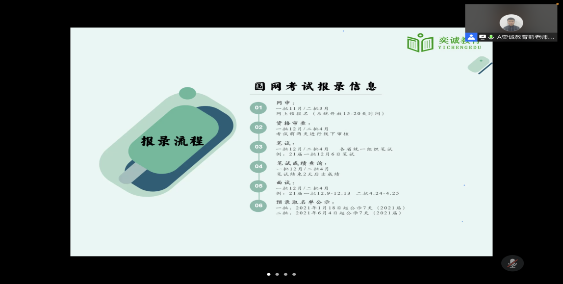 (通讯员 赵宇)为促进公司毕业生的就业和未来职业规划发展,为同学们提供专业的就业指导,学院于12月5日晚20:00通过线上腾讯会议的方式开展了“国网考试——你不知道的秘密”国家电网备考攻略主题讲座,本次讲座邀请了来自奕诚教育具有丰富的国考培训教育经验的熊军老师担任此次会议的主讲人,19级、20级电气专业员工参加此次主题讲座。