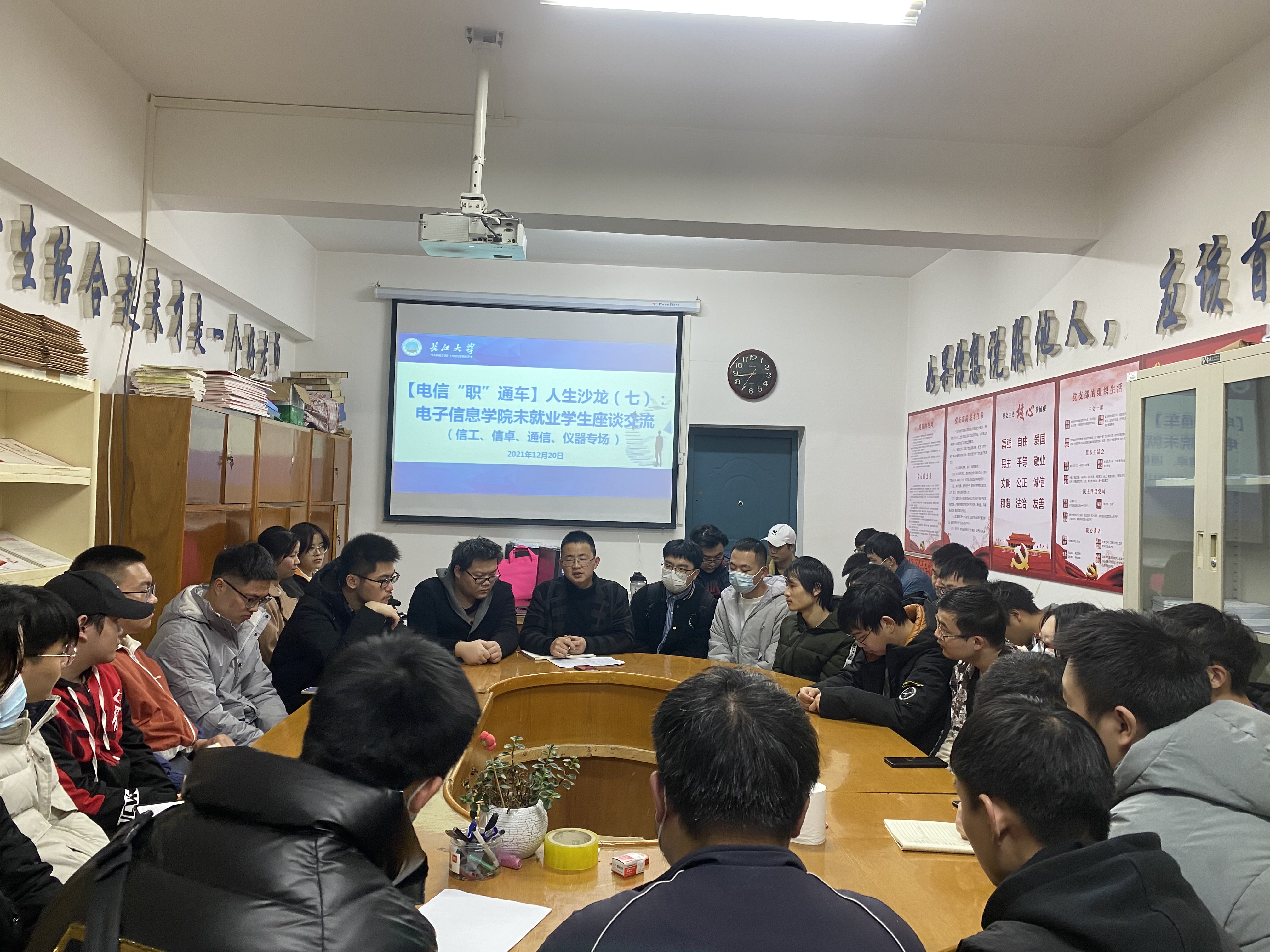 为了解员工就业意愿,倾听求职诉求,充分为员工提供针对性的建议。12月23日晚,学院于党员活动室为未就业员工开展求职指导,现场为员工提供答疑解惑工作,年级辅导员王齐禄老师和学院就业专干沈马锐老师参与座谈。
