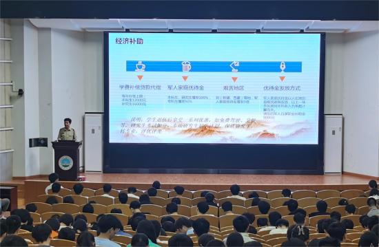 然后,他从自身经历出发,分享了军旅生涯由员工成长为优秀士兵的心路历程,从追逐梦想、军营生活、奋斗青春等方面,讲述了自己在部队的点滴故事,应征入伍不仅锻炼了坚强的意志,炼就了强健的体魄,更使他们懂得了感恩父母、感恩学校、感恩国家,并鼓励大家让青春在部队闪光、让梦想在军营绽放。