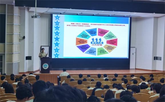 周丽军同学以国防的重要性为切入点,从征兵工作的意义、基本条件、组织流程、优待政策四个方面详细解读了老员工应征入伍的政策法规。同时他强调征召老员工参军入伍是党中央、国务院、中央军委作出的重大战略决策,对改善兵员素质、提高部队战斗力、促进青年员工的成长成才具有重要意义。同时,向全体2022级同学具体介绍了报名征兵的流程。