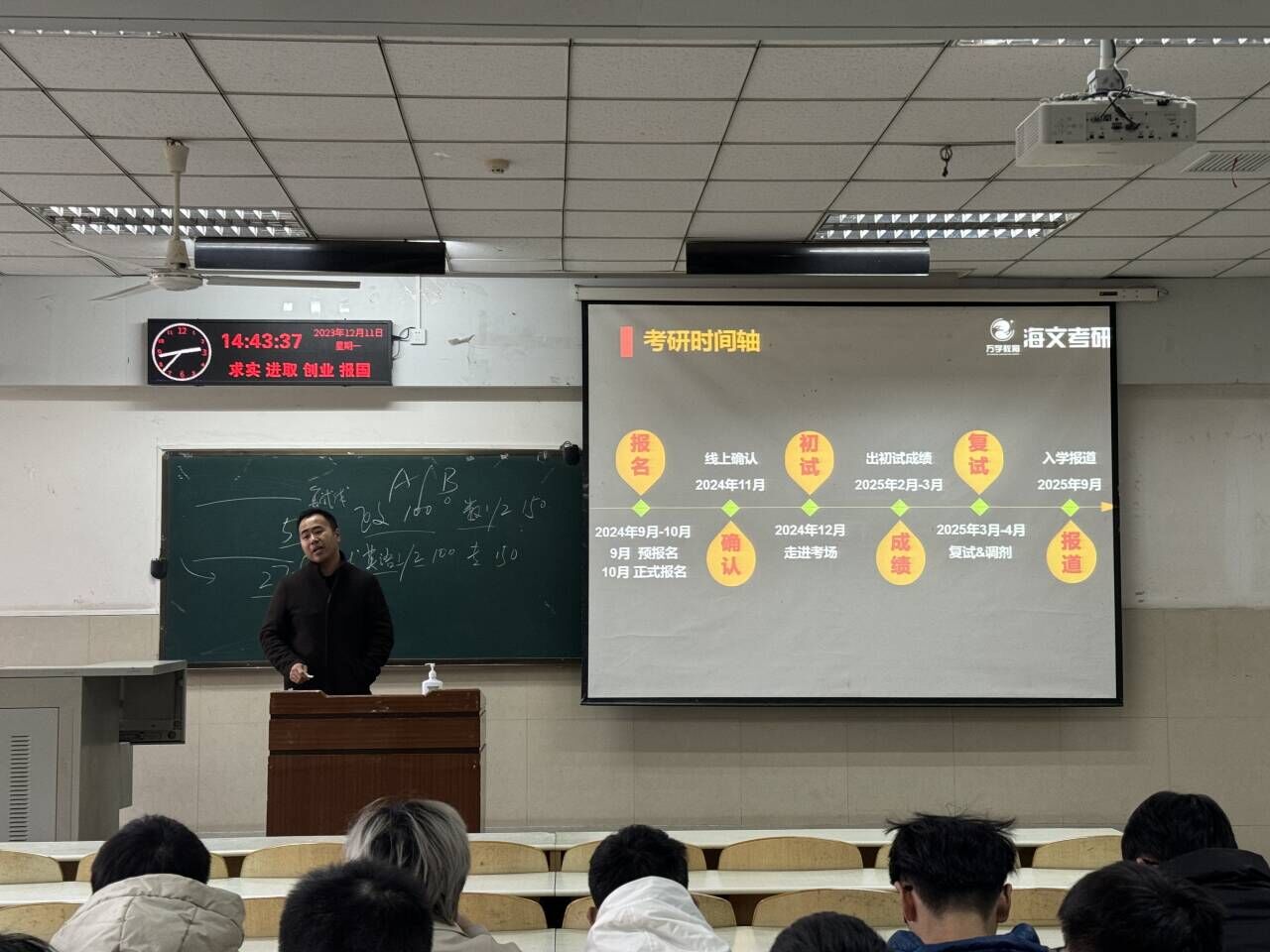 为营造良好的学习氛围,进一步推进学风建设,帮助广大考研学子明确考研目标,合理规划考试内容,增强考研信心,12月10日至11日,学院面向2021级本科生分专业连续举办2场硕士研究生招生入学考试辅导讲座。讲座邀请到海文考研万学教育湖北分校董事长杨剑锋作为主讲,2021级本科生辅导员李蒙全程参与。