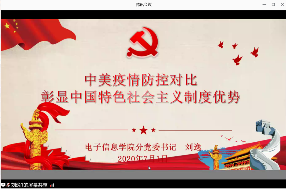 2020年7月1日上午9点,电子信息学院通过腾讯会议召开了“迎党的生日、讲战疫故事、悟初心使命”为主题的党课学习。会议由学院分党委副书记郭启炜主持,全体教工党员和员工党员参加了此次会议。