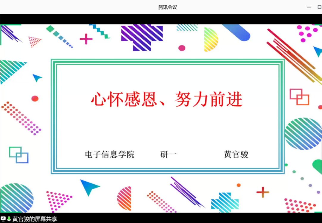 会议伊始,学院分党委副书记郭启炜带领全体与会同志重温了入党誓词。电信学院研究生支部党员黄官骏同志向大家分享了题为《心怀感恩、努力前进》的抗疫回国感悟,在回国之前,欧洲众多国家疫情开始暴发和蔓延,学校的领导和老师有如家人一般,给予了自己温暖的关心和问候,学院领导和老师时刻关心黄官骏同志的身体健康,嘱咐做好个人防护。黄官骏同志总结时说到:感谢奋斗在疫情前线的英雄们为我们奉献的一切!感谢各位领导、各位老师一直对自己的关心和爱护。