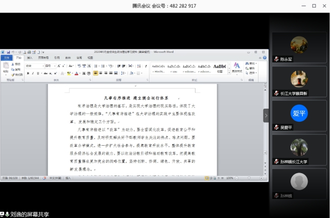 接下来,中心组成员学习了《教育部高等教育司2020年工作要点》、“凡事三有”推进大学治理现代化和《省级文明单位测评体系》相关内容。通过学习,分党委副书记郭启炜表示作为高校教师要有信心和决心打赢高校疫情防控阻击战,因势利导做好高公司党建和思想政治工作,确保高校政治安全、师生平安、校园稳定、运转有序。
