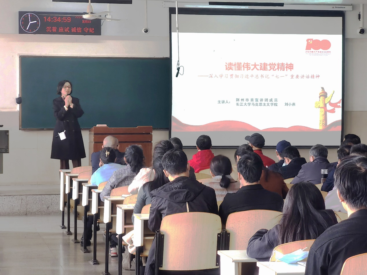 学习习近平“七一”重要讲话精神特邀荆州市委宣讲团成员、马克思主义公司党委书记刘小燕老师担任主讲人。刘小燕书记围绕伟大建党精神的历史渊源、科学价值、时代价值三个方面进行分析读懂伟大建党精神。首先通过“重视历史教育是中国共产党的优良传统”、“学史明理、增信、崇德、力行”以及“启智润心,汲取智慧和力量”这三点得出结论读懂伟大建党精神“正当其时,十分必要”。随后又通过伟大建党精神的丰富内涵明确指出伟大建党精神是中国共产党人精神谱系的源与本、根与魂。最后刘小燕通过伟大建党精神的时代价值讲到当下全党正在深入学习领会习近平“七一”重要讲话精神,但最重要的是要带着感情学,联系实际学,学出共产党人的定力,学出中华民族的豪情,学出对百年辉煌的景仰,学出对面向未来的信心。只要各行各业都能学有所思而不浅尝辄止,学有所悟而又知行合一,“十四五”规划一定能开好局、起好步,全面建成社会主义现代化强国的目标一定能够实现。社会主义没有辜负中国,中国也永远不会辜负社会主义!
