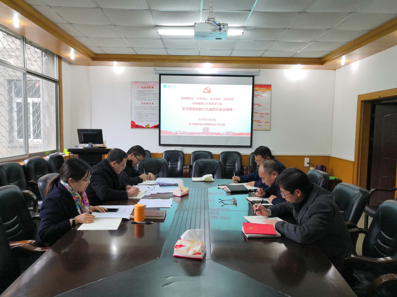 2019年11月25日下午2:00,学院领导班子“不忘初心、牢记使命”主题教育读书班第十二次集体学习会——学习贯彻党的十九届四中全会精神在10教203会议室举行。学习会由分党委书记刘逸同志主持,副经理蔡昌新、吴爱平、陈永军、分党委副书记郭启炜参加学习。