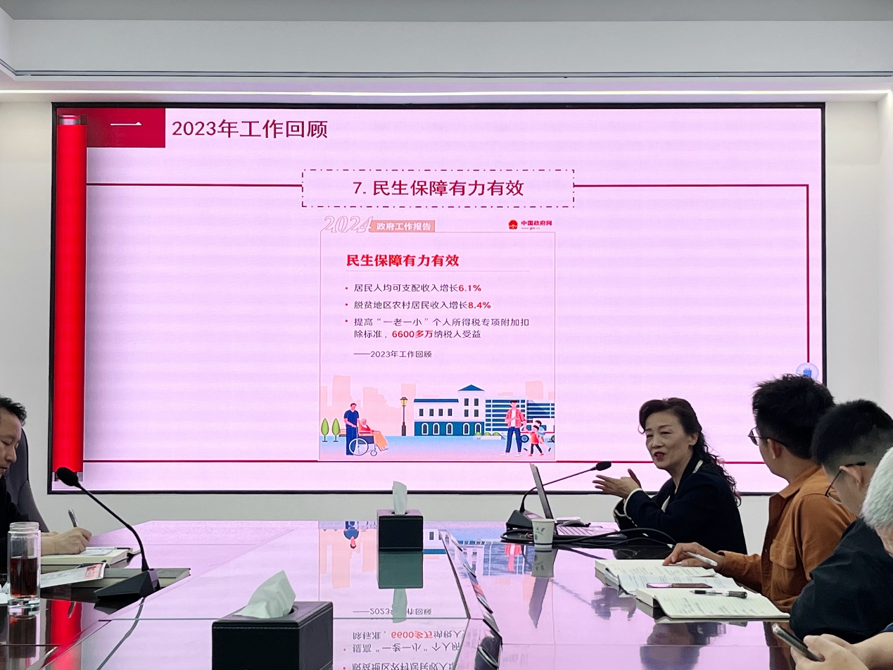 贾廷秀教授以“团结凝聚力量 奋斗铸就伟业”为题开展深入学习领会全国两会精神专题宣讲。宣讲会上,贾廷秀教授围绕2023年的工作回顾、2024年经济社会发展的总体要求和政策取向以及2024年政府工作任务3个方面,数字化、全景式、多维度解读了全国两会精神;她还重点介绍了全国两会关于科教兴国的有关要求,结合学院的学科专业特点,解读了新质生产力的内涵。整场授课主题鲜明、层次清晰、内容丰富,具有很强的政治性、思想性和启发性。经理罗明璋表示,贾廷秀教授的宣讲给我们启发很大,我们要深入学习领会全国两会精神,力争在推进现代化产业体系建设、发展新质生产力的过程中做出电信学院应有的贡献。