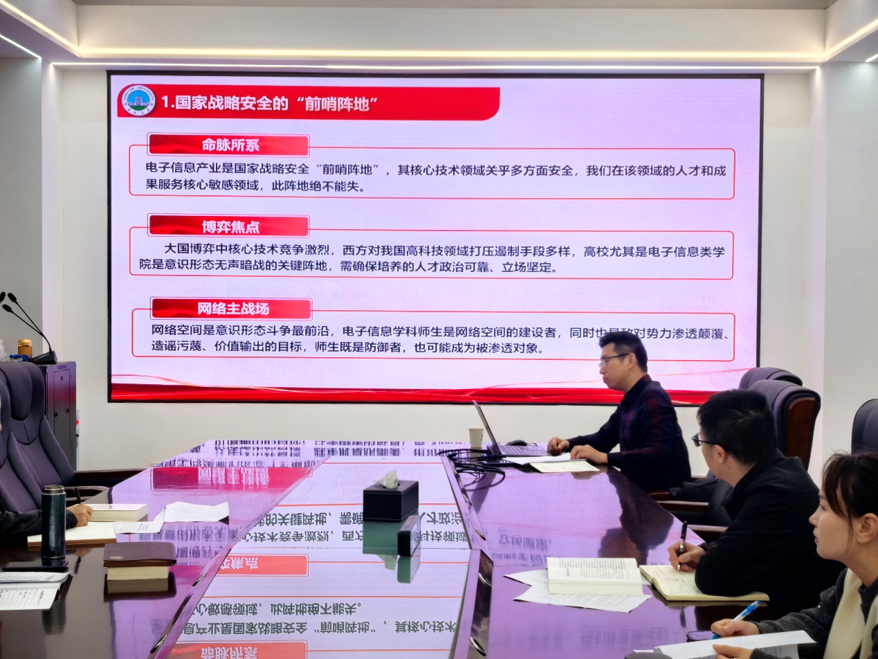 会议集中学习了习近平总书记关于总体国家安全观的重要论述,传达了上级关于意识形态工作的有关要求。集中学习后,党委宣传部副部长文启华以《筑牢思想防线 履行时代使命》为题开展意识形态工作专题辅导。他主要围绕高校意识形态工作的极端重要性与特殊性、学院意识形态工作的突出风险点和筑牢学院意识形态安全屏障三方面展开,进一步指明了学院在开展意识形态工作时需要严把关的各种情况,对压紧压实责任、筑牢学院意识形态安全屏障提出了具体要求。