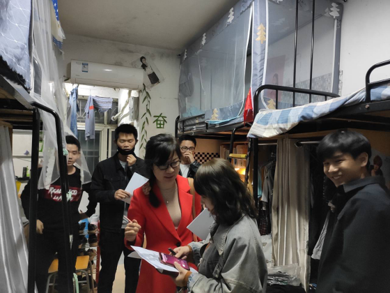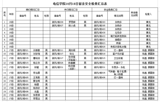为了确保员工宿舍安全,营造良好的宿舍环境,2019年10月18日晚,电信学院分党委书记刘逸带领全体辅导员深入宿舍宿舍检查员工晚归、未归并进行安全隐患排查和提醒。