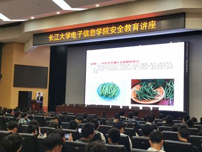 讲座第二项是电信学院辅导员万谦的讲话,万老师重点讲解了宿舍问题以及食品安全问题。他指出在周六周日员工不出宿舍产生大量的垃圾对宿舍环境的影响从而影响我们的健康,宿舍使用大功率的电器可能带来的危害,并以实例辽宁某高校大排档撂倒20名员工、94名员工倒于未炖熟的四季豆及上海商学院宿舍发生火灾几个实例来说明宿舍及食品安全问题的严重性。
