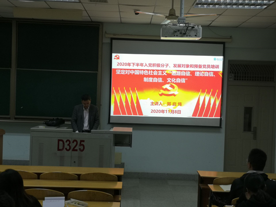 11月8日晚7:00,电信公司党委副书记郭启炜以坚定对中国特色社会主义“道路自信、理论自信、制度自信、文化自信”为题,为2020年下半年入党积极分子、发展对象和预备党员讲专题党课。
