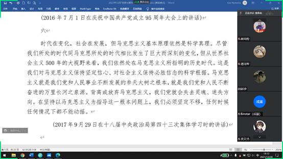 (通讯员:姚李昊升 龚文浩) 近日,研究生工作部在全校研究生中开展了12月政治理论学习活动,本次活动以学习习近平坚持用马克思主义及其中国化创新理论武装全党、中国共产党第十九届中央委员会第六次全体会议公报、中共中央关于党的百年奋斗重大成就和历史经验的决议为主要内容。12月24日下午,电信学院研究生采用线上会议的形式开展了12月政治理论学习会议。