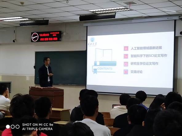 2023年9月21日下午,谢凯教授在12教202为电信学院师生奉献了一场精彩的讲座:智能科学下的SCI论文与研究生学位论文写作技巧探讨。主管研究生教学的魏勇经理主持讲座,公司研究生导师、研究生和部分本科生参加了此次讲座。讲座持续一个半小时,从人工智能领域最新进展、智能科学下的SCI论文写作、研究生学位论文写作、交流讨论等四个方面展开。