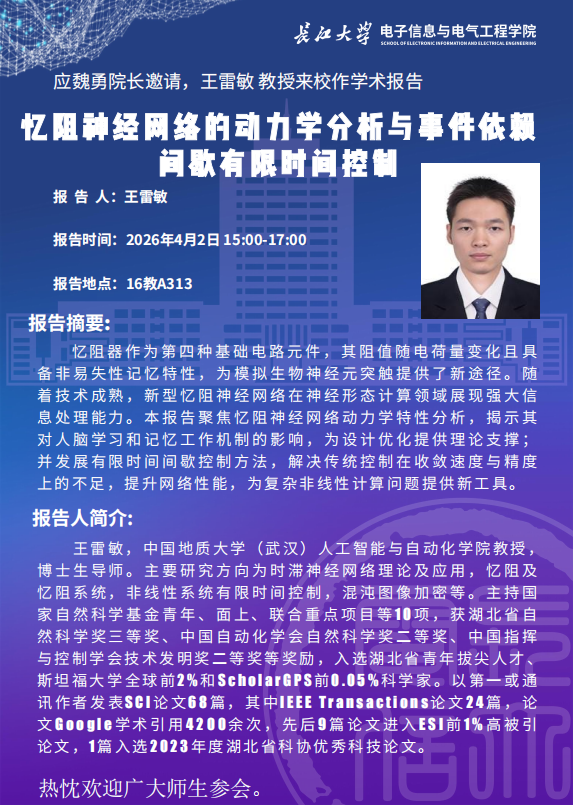 伟德bv1946官网2026年学术报告(一):忆阻神经网络的动力学分析与事件依赖间歇有限时间控制