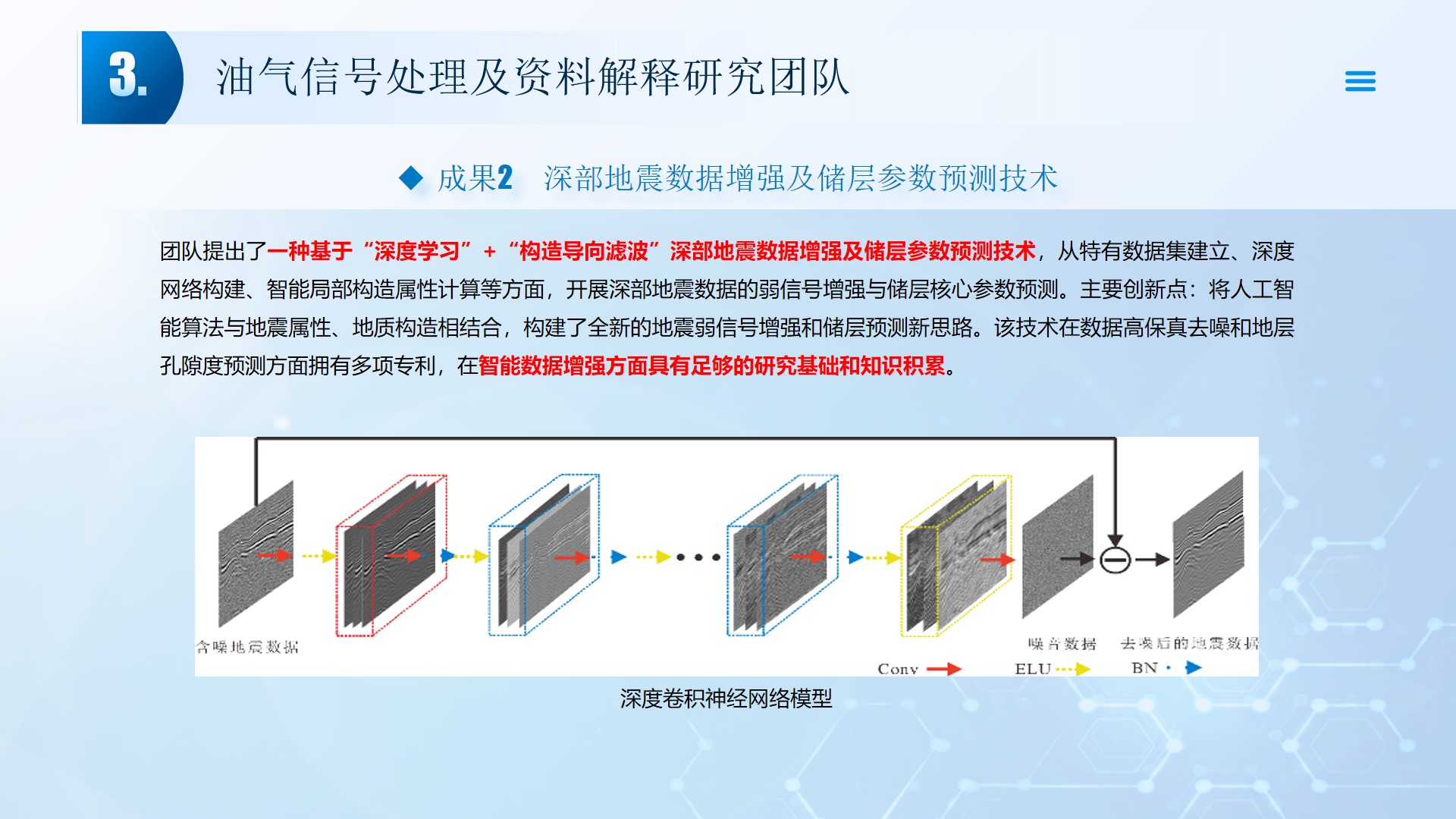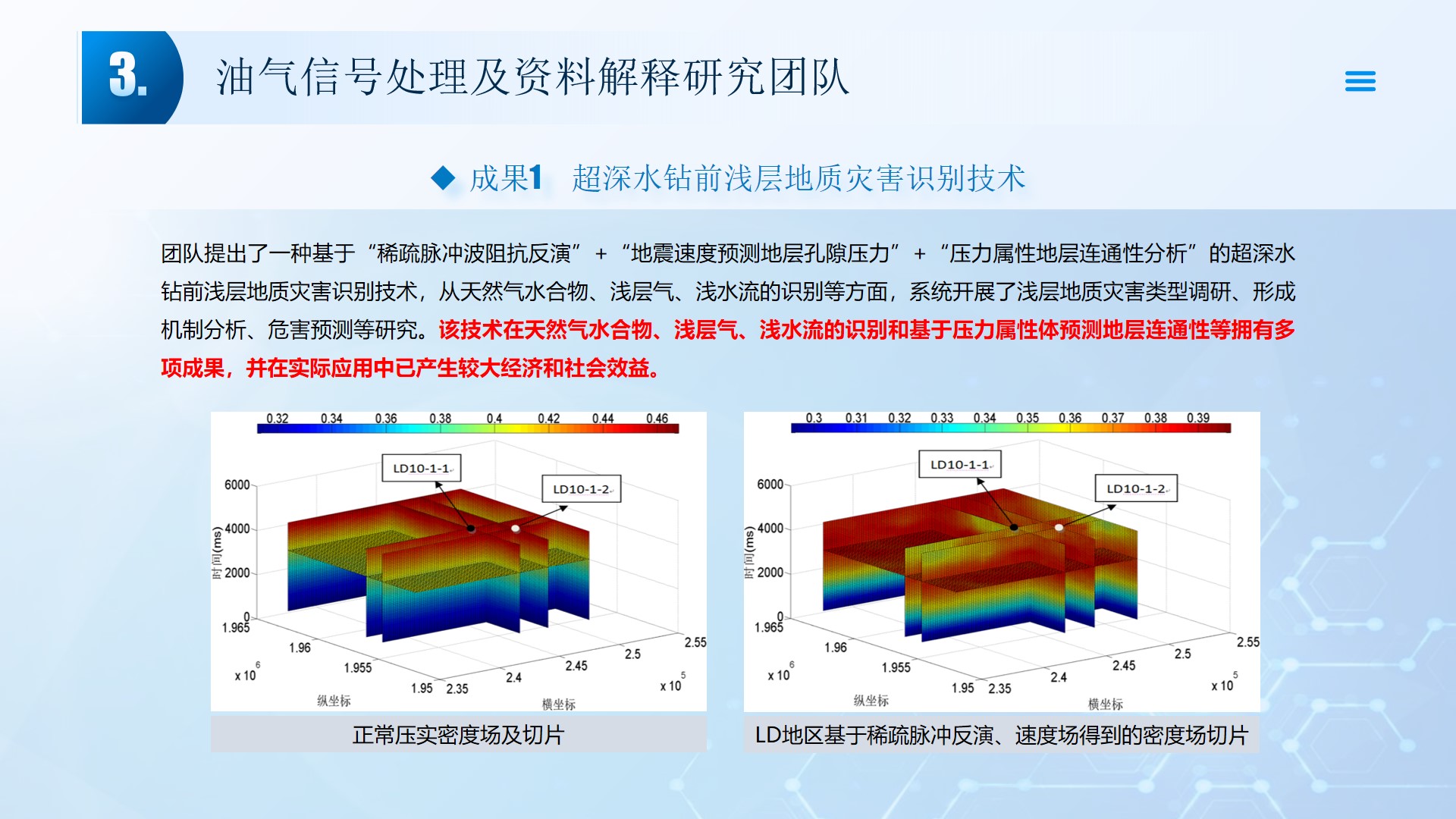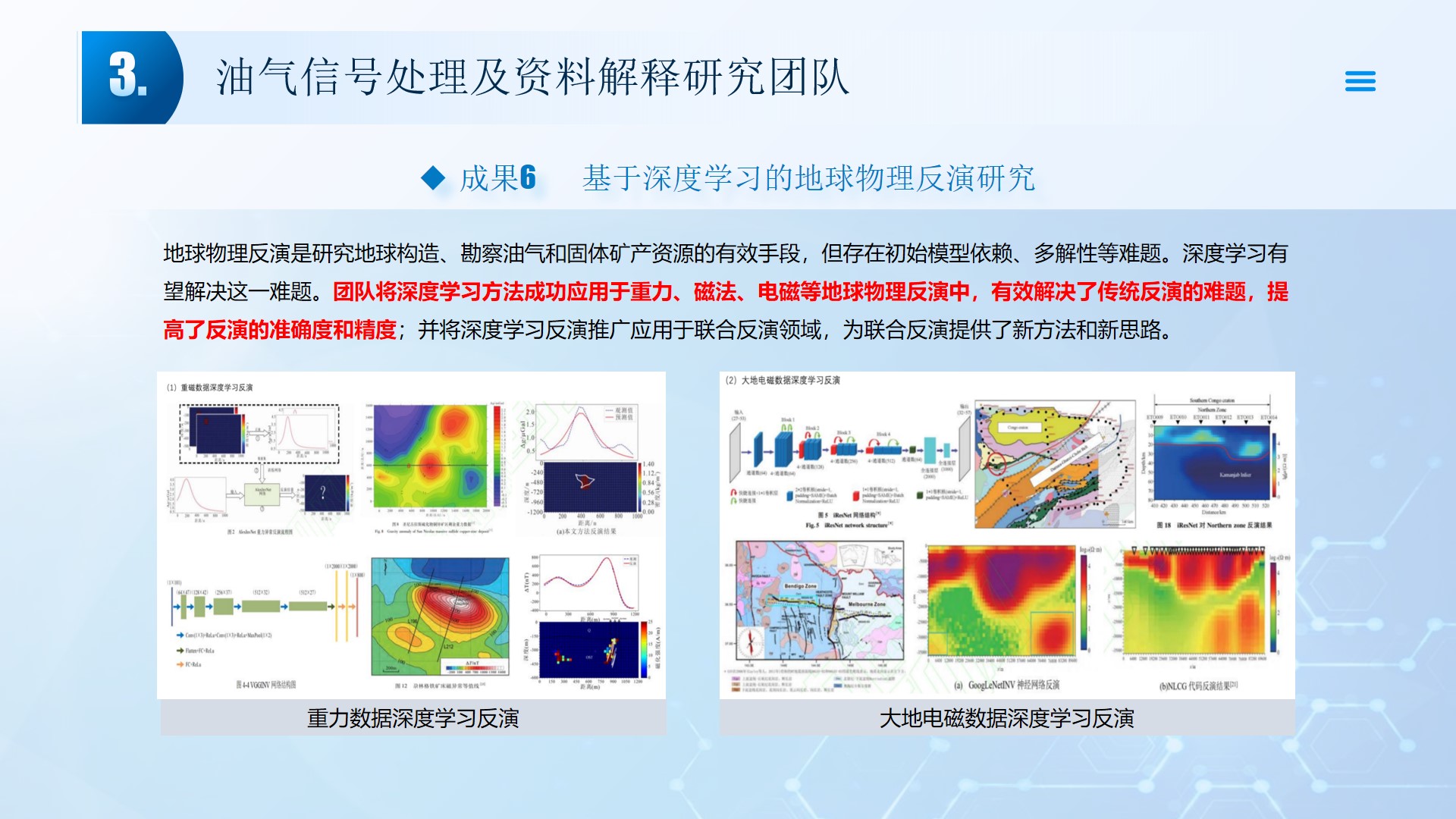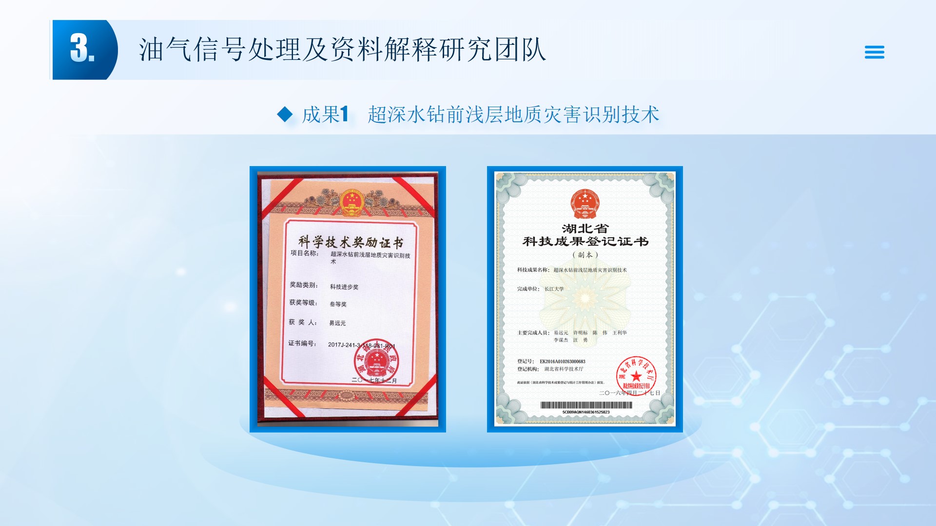 团队长期从事地震资料解释、深水浅层地质灾害钻前预测、地质工程一体化应用等方向的研究。先后主持或参与国家自然科学基金面上项目2项,承担国家科技重大专项4项,省部级及油田委托项目《基于GPU的海量地震数据并行可视化技术研究》、《华北油田地震反射弱信号储层预测技术方法研究》、《云平台下的智慧农业系统》等其他各类科研项目100余项。出版学术专著和教材10部,先后在《IEEE Access》、《IET Image Processing》、《IET Biometrics》、《IET Signal Processing》、《Electronics Letters》、《Sensors》、《计算机应用》等国内外主要学术刊物上公开发表学术论文200余篇。授权国家发明专利20件、实用新型专利8件、软件著作权15件,获得各类科技进步奖励5项。 指导国家级老员工创新与创业项目5项,连续3年入选国创年会(2019-2021),3项被评为优秀。指导研究生和本科生参加挑战杯和互联网+大赛获奖5项,其中包括国赛铜奖2项,省一等奖2项,省二等奖3项。