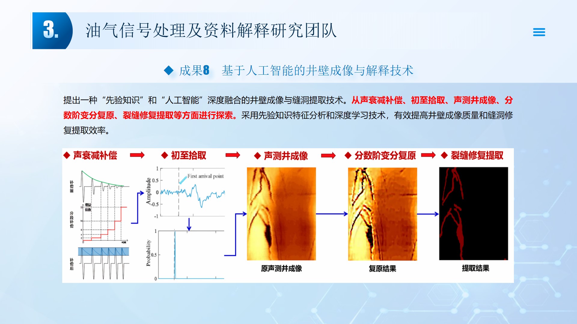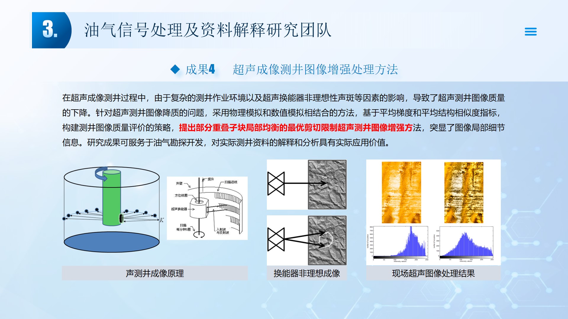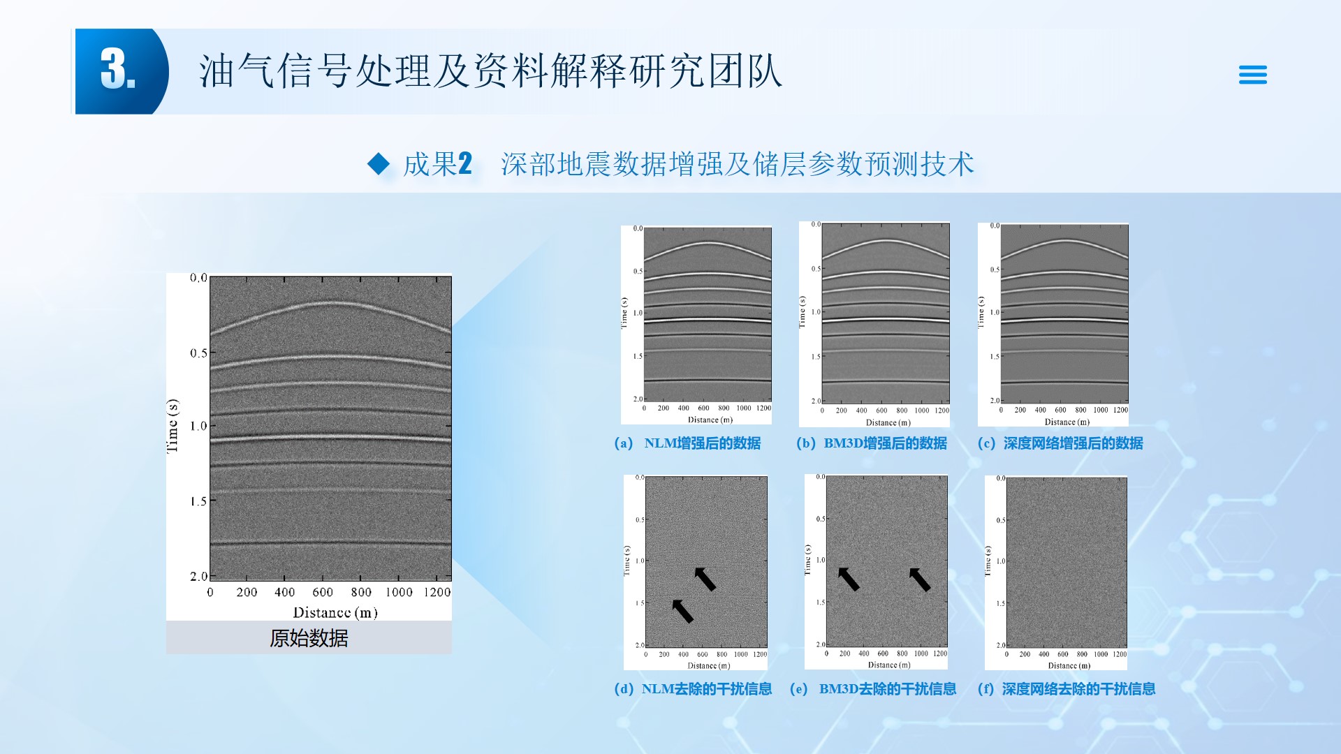 团队长期从事地震资料解释、深水浅层地质灾害钻前预测、地质工程一体化应用等方向的研究。先后主持或参与国家自然科学基金面上项目2项,承担国家科技重大专项4项,省部级及油田委托项目《基于GPU的海量地震数据并行可视化技术研究》、《华北油田地震反射弱信号储层预测技术方法研究》、《云平台下的智慧农业系统》等其他各类科研项目100余项。出版学术专著和教材10部,先后在《IEEE Access》、《IET Image Processing》、《IET Biometrics》、《IET Signal Processing》、《Electronics Letters》、《Sensors》、《计算机应用》等国内外主要学术刊物上公开发表学术论文200余篇。授权国家发明专利20件、实用新型专利8件、软件著作权15件,获得各类科技进步奖励5项。 指导国家级老员工创新与创业项目5项,连续3年入选国创年会(2019-2021),3项被评为优秀。指导研究生和本科生参加挑战杯和互联网+大赛获奖5项,其中包括国赛铜奖2项,省一等奖2项,省二等奖3项。