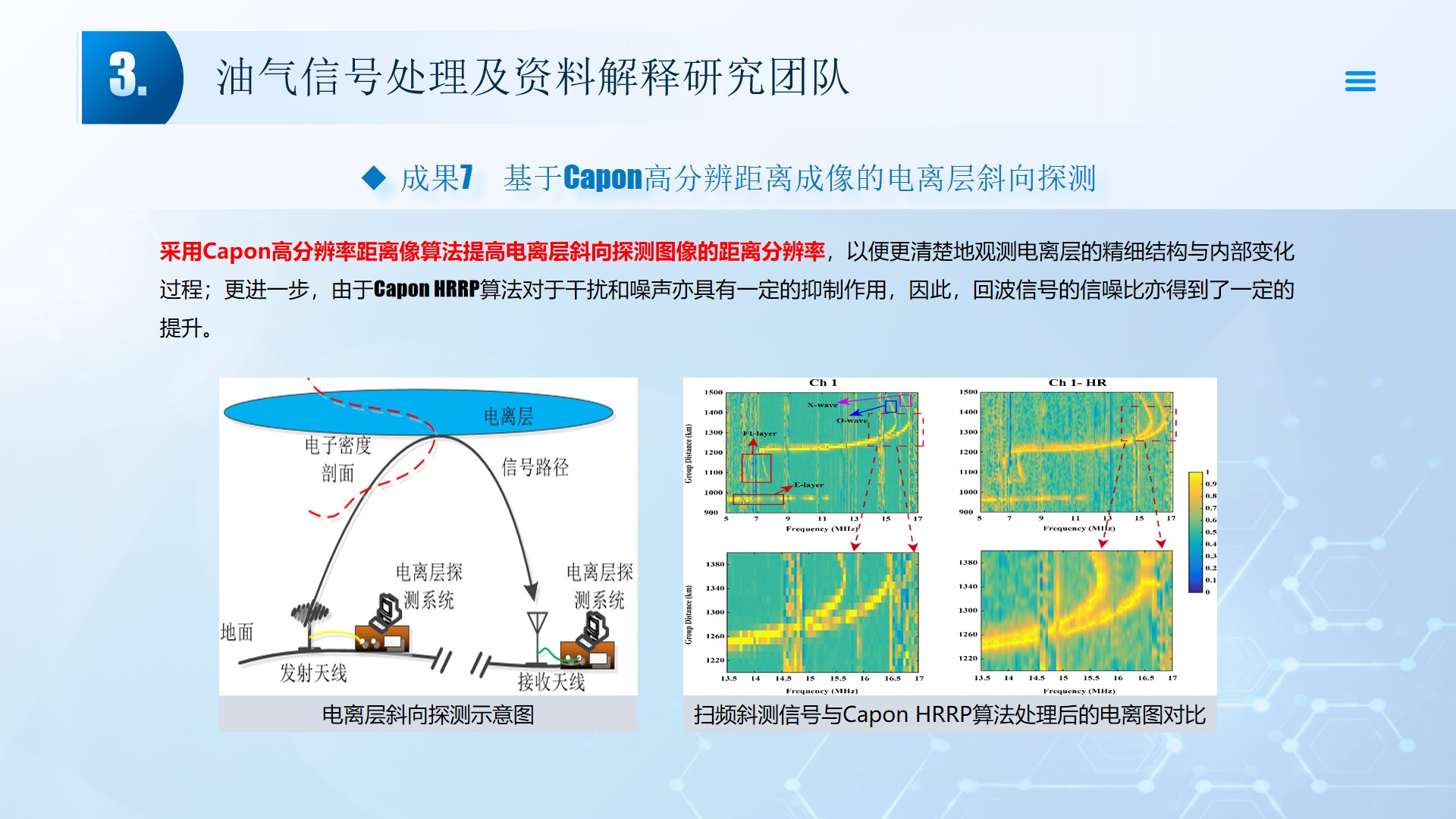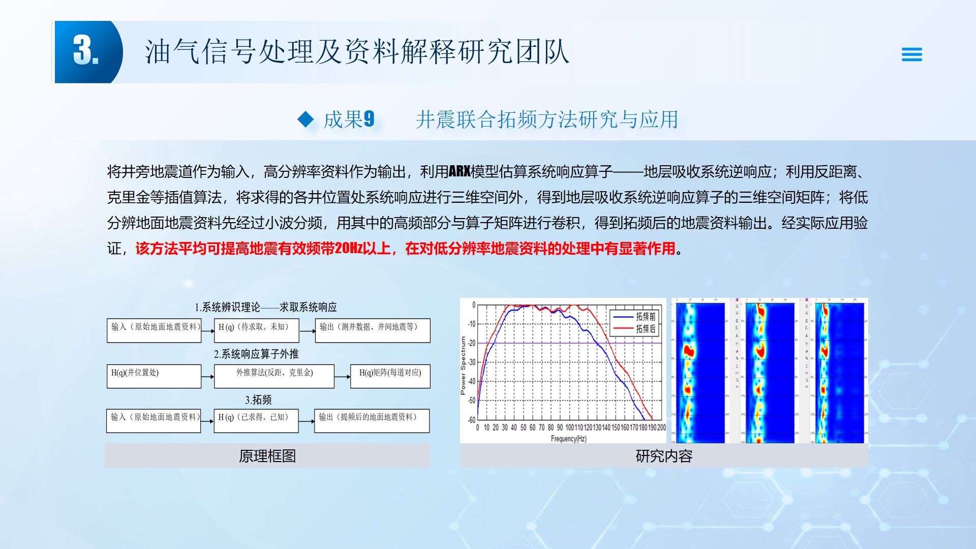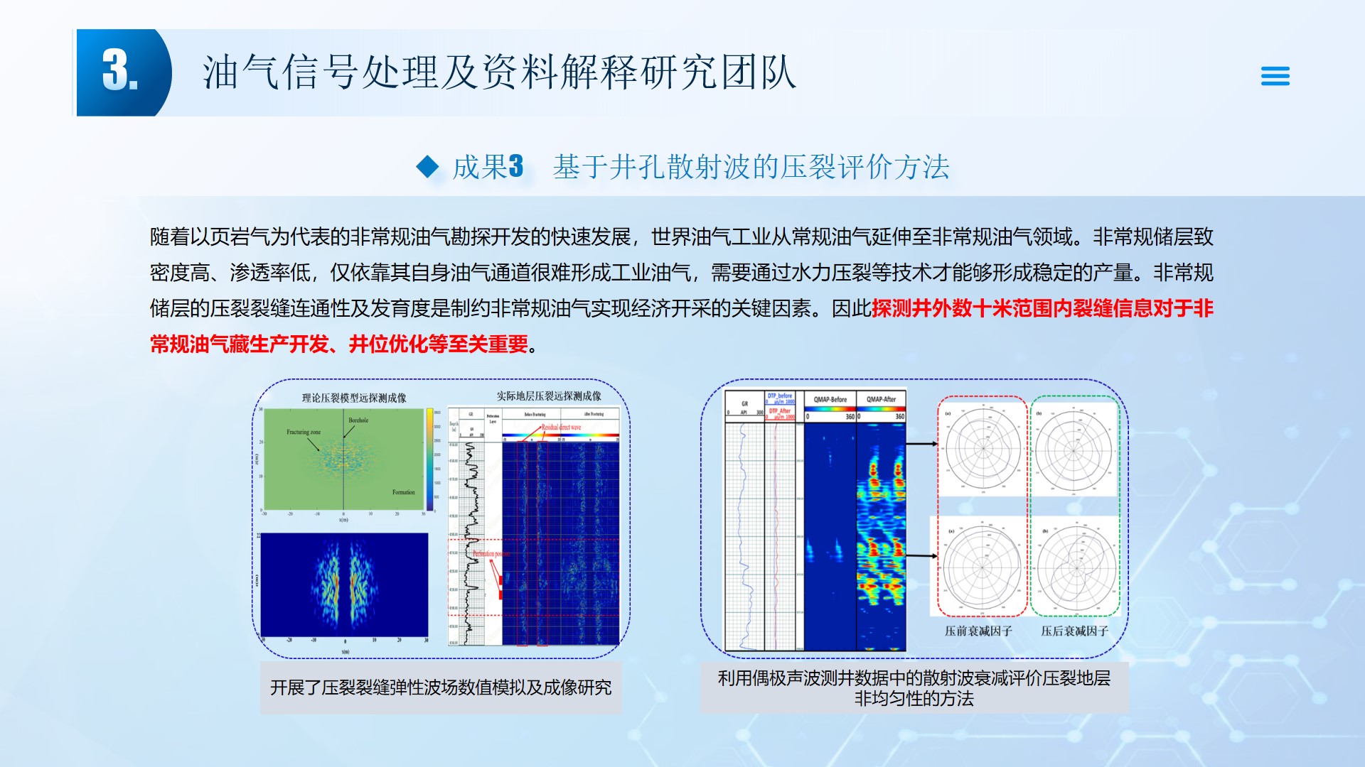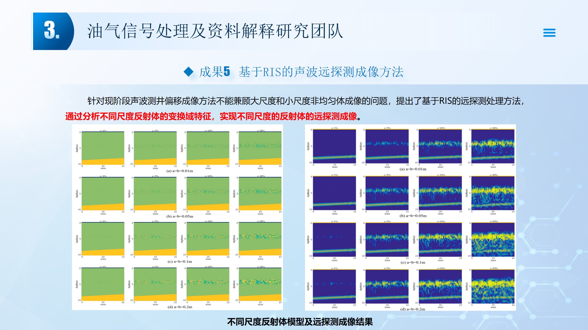 团队长期从事地震资料解释、深水浅层地质灾害钻前预测、地质工程一体化应用等方向的研究。先后主持或参与国家自然科学基金面上项目2项,承担国家科技重大专项4项,省部级及油田委托项目《基于GPU的海量地震数据并行可视化技术研究》、《华北油田地震反射弱信号储层预测技术方法研究》、《云平台下的智慧农业系统》等其他各类科研项目100余项。出版学术专著和教材10部,先后在《IEEE Access》、《IET Image Processing》、《IET Biometrics》、《IET Signal Processing》、《Electronics Letters》、《Sensors》、《计算机应用》等国内外主要学术刊物上公开发表学术论文200余篇。授权国家发明专利20件、实用新型专利8件、软件著作权15件,获得各类科技进步奖励5项。 指导国家级老员工创新与创业项目5项,连续3年入选国创年会(2019-2021),3项被评为优秀。指导研究生和本科生参加挑战杯和互联网+大赛获奖5项,其中包括国赛铜奖2项,省一等奖2项,省二等奖3项。